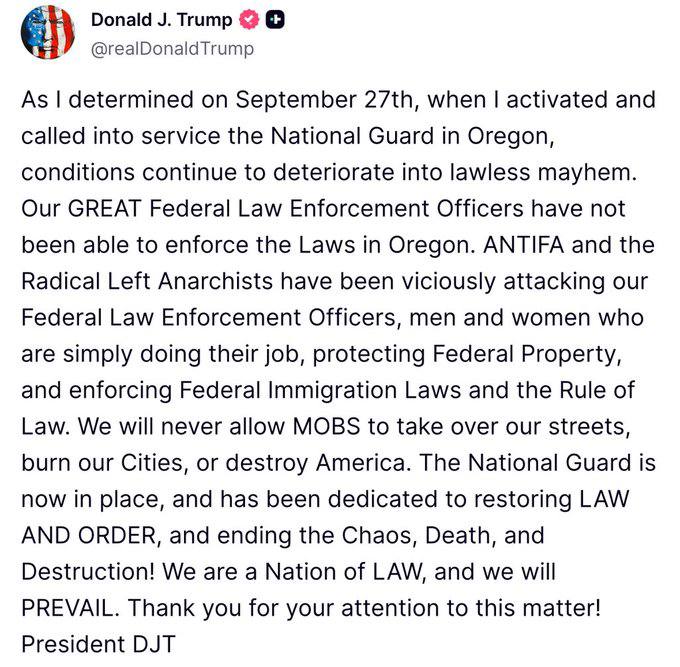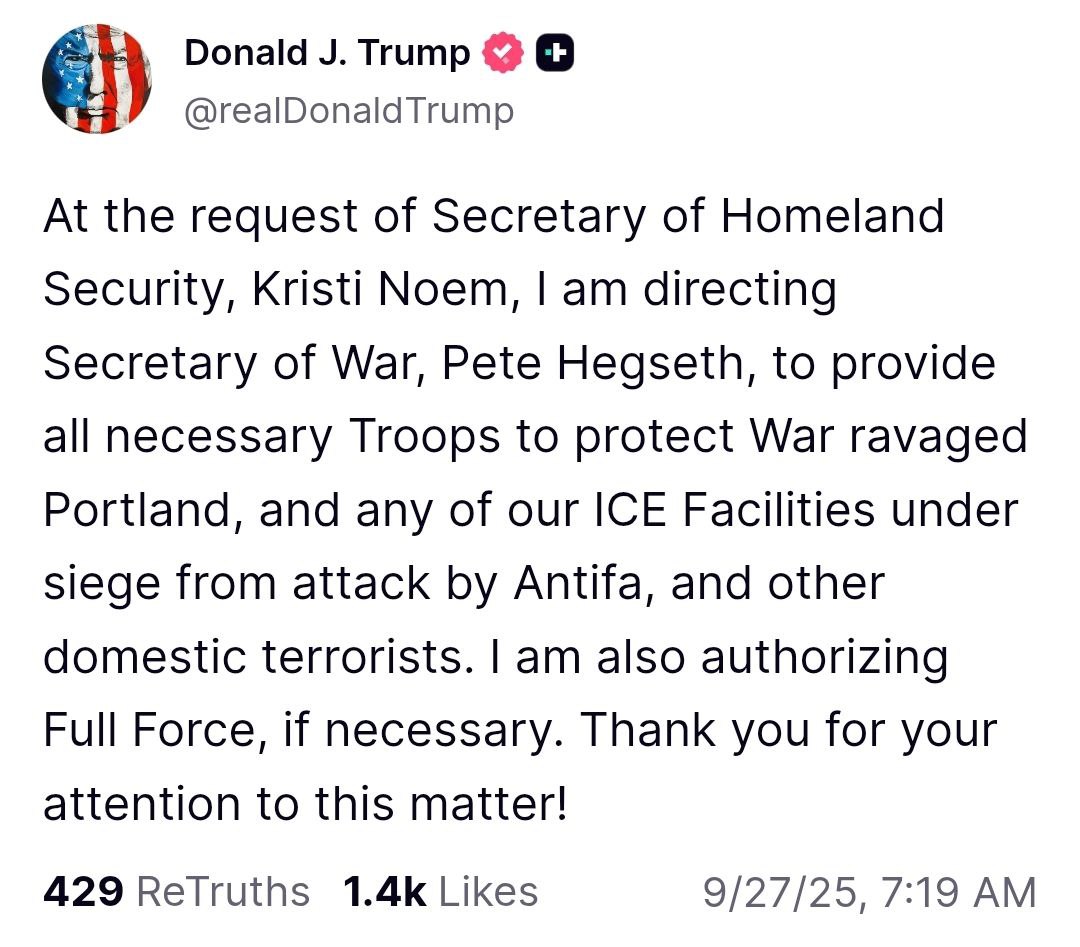 Department of War authorized to protect Portland and ICE facilities against attacks by Antifa.