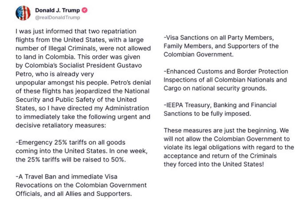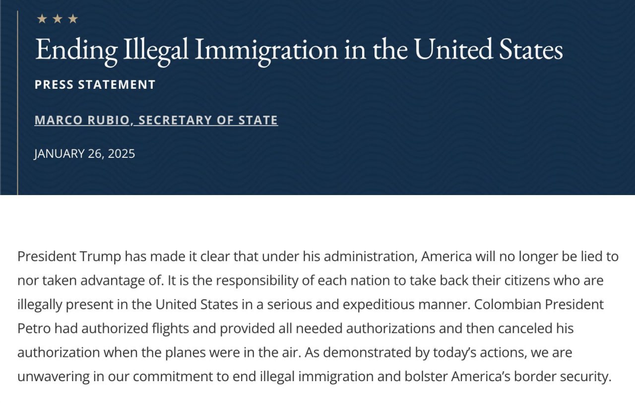 President of Colombia agrees to all of Trumps terms & conditions including the unrestricted acceptance of illegal aliens including on US military aircraft, without limitation or delay.