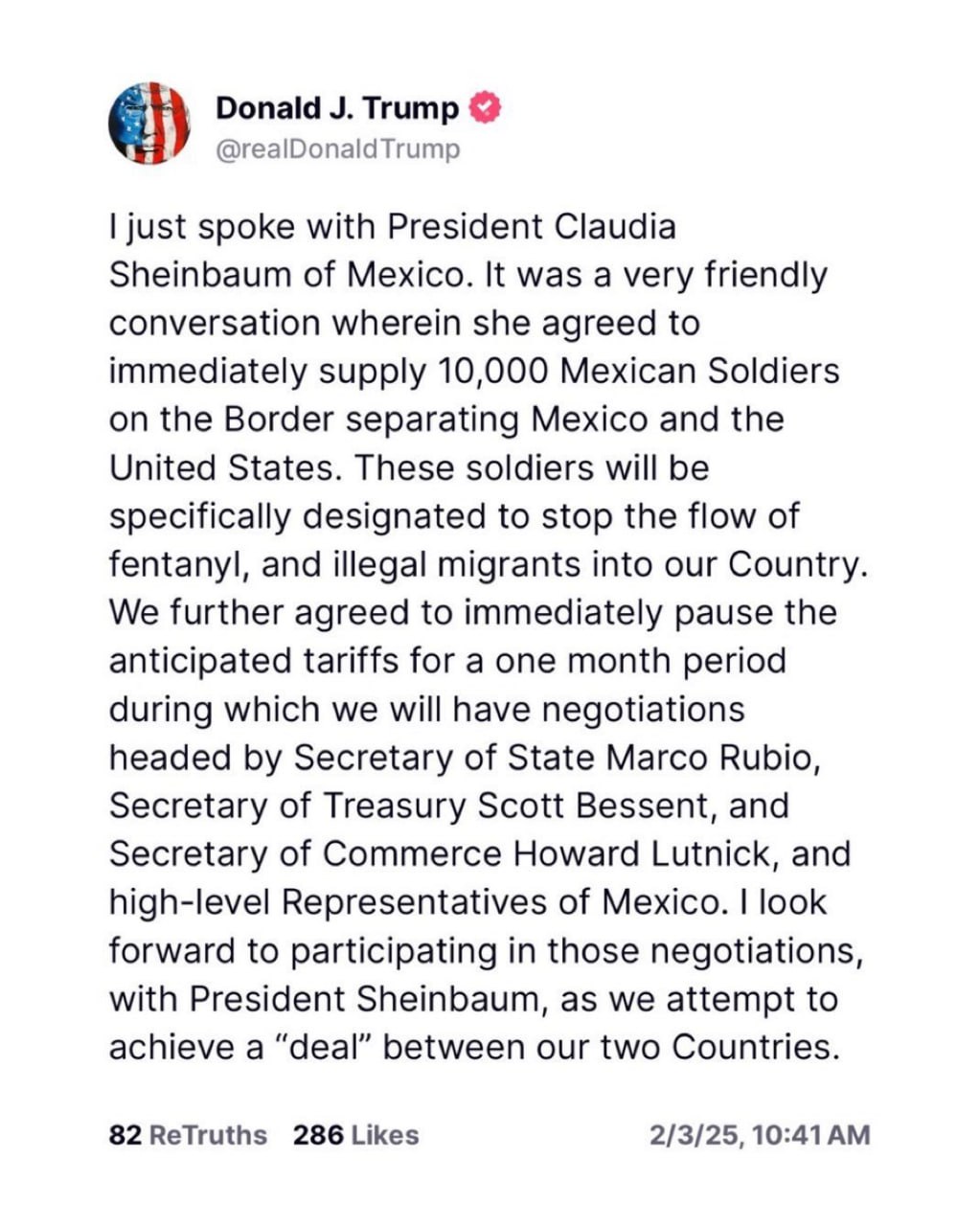 Trump pauses tariffs on Mexico for one month after Pres Claudia Sheinbaum will reinforce border with 10,000 Mexican troops